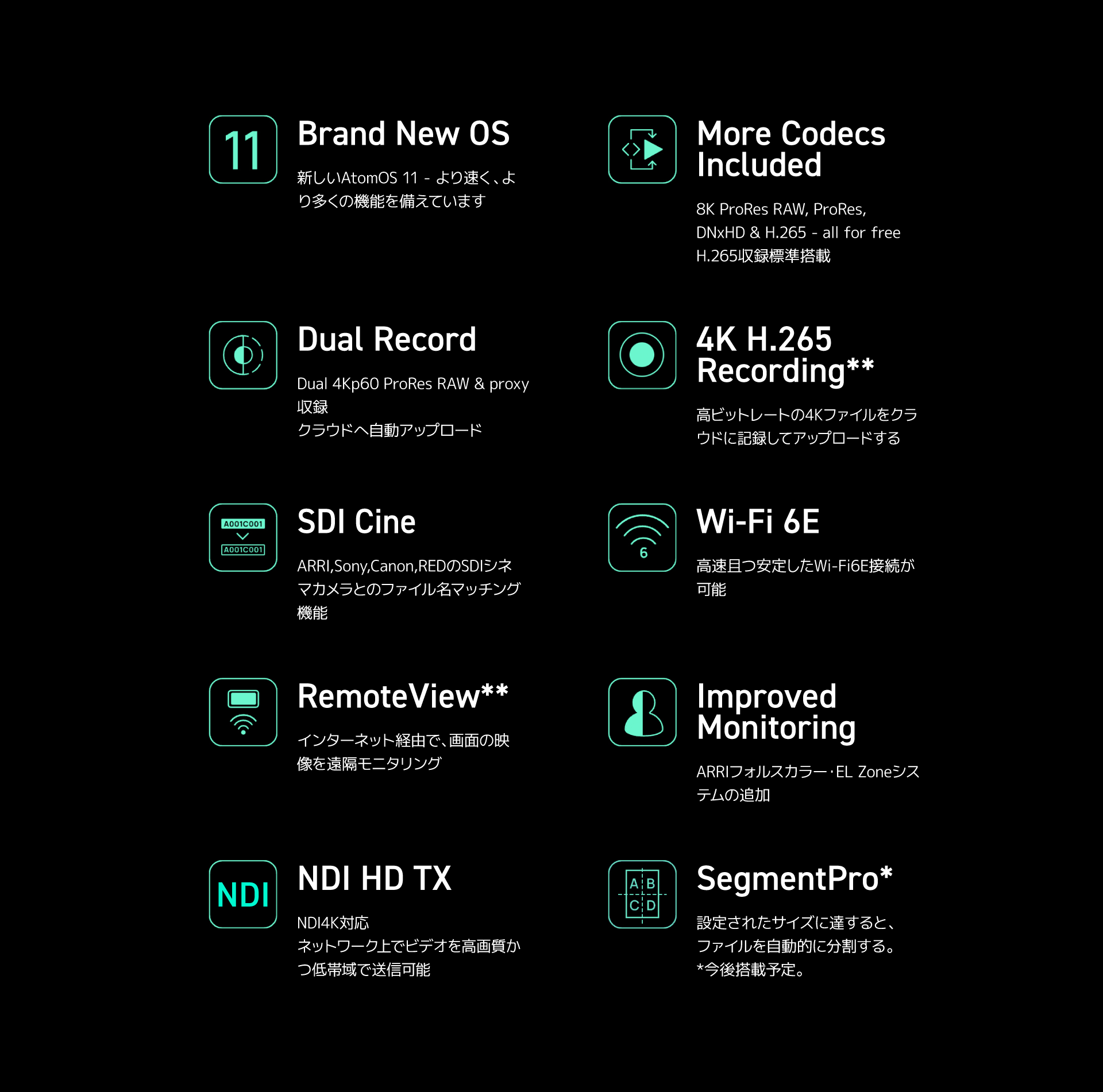 従来からのモニタリング機能とバックアップ収録を踏襲しながらも、新たなAtomIC チップセットとメモリ管理を最適化する新しいユーザー インターフェイス AtomOS 11 を搭載。RecordAssist、 PlayBackAssist、SegmentPro、ELZone、Arri False color などの新たに優れたモニタリング機能と録画機能が追加され、撮影現場での作業をサポートします。